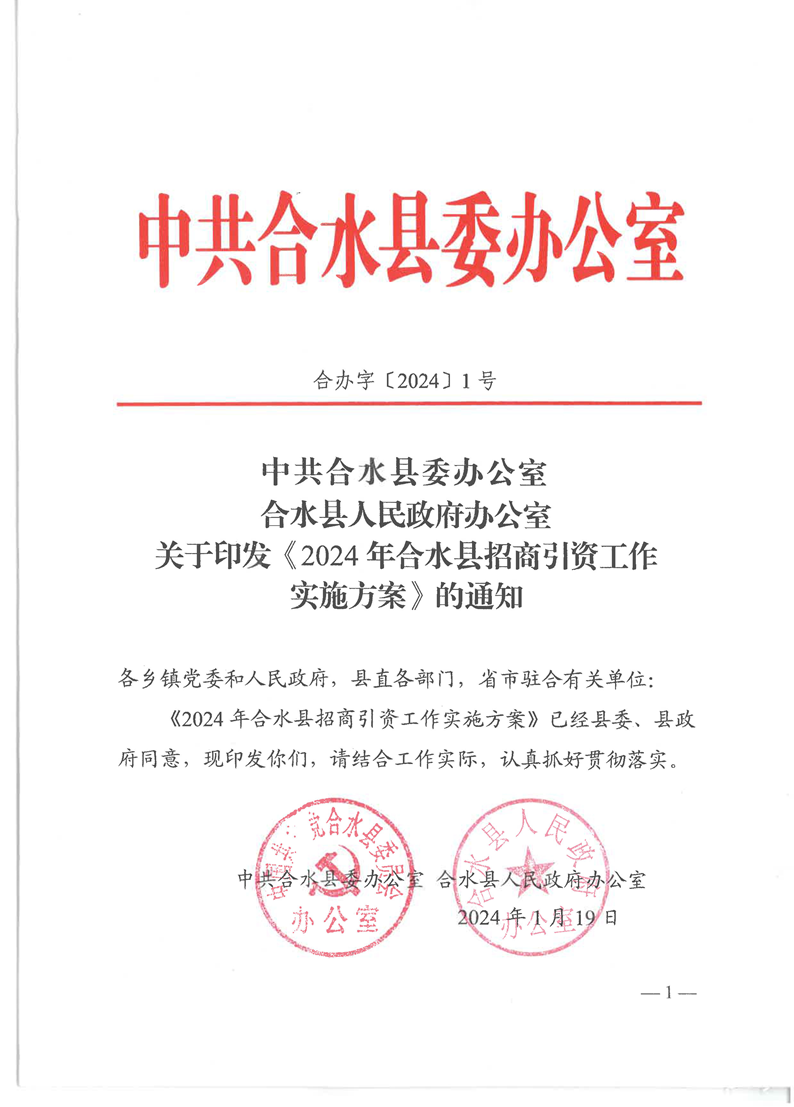 索引号: 3070211020000073000000/2024031100000017 发布机构: 生效日期: 2024-03-11 废止日期: 文 号: 所属主题: 部门文件 中共合水县委办公室合水县人民政府办公室关于印发《2024年合水县招商引资工作实施方案》的通知 来源: 发布时间:2024-03-11 浏览次数: 次 【字体:小 大】 【打印正文】 分享到: 【字体:小 大】