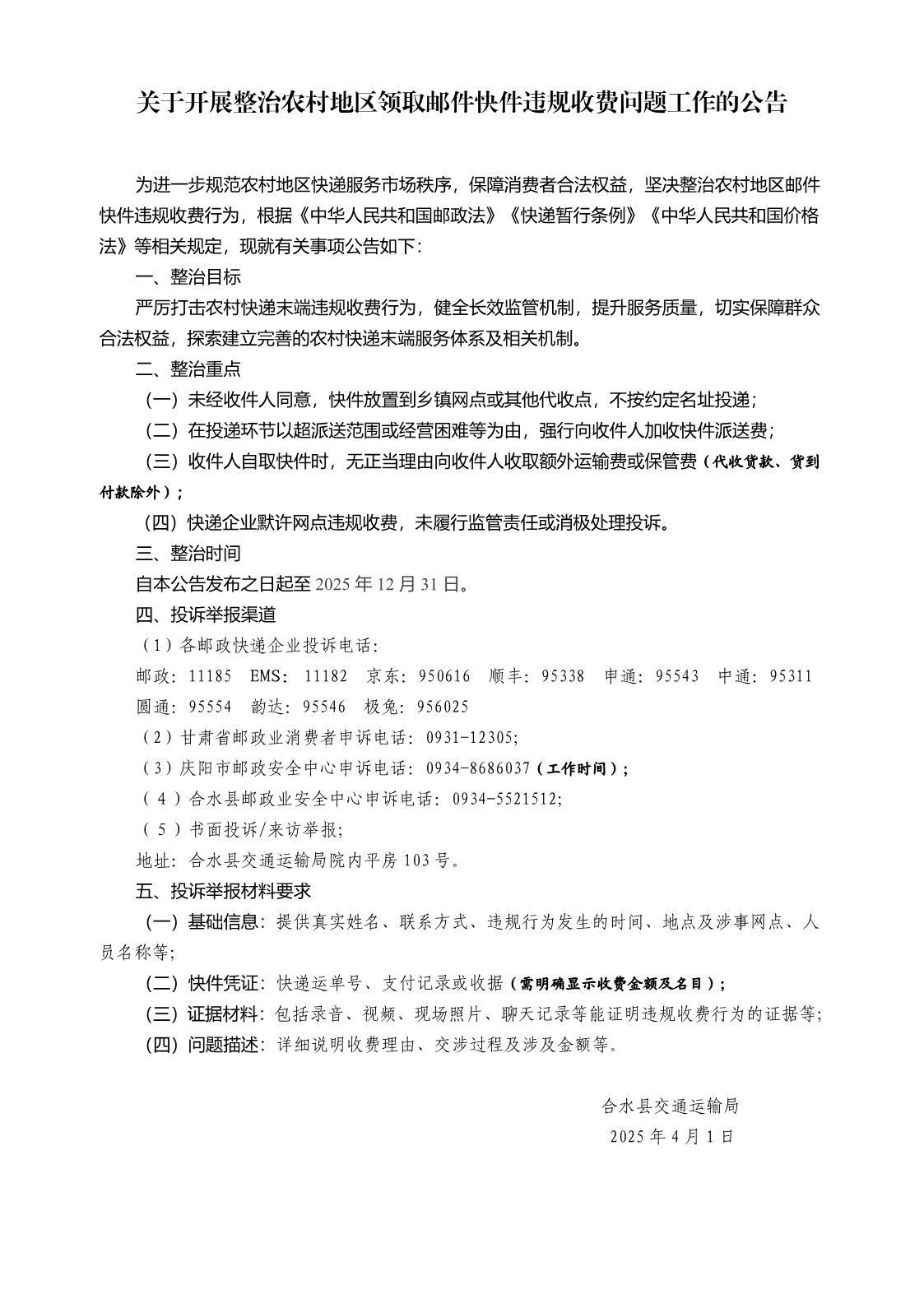 索引号: 3070211020000203000000/2025111900000036 发布机构: 生效日期: 2025-04-01 废止日期: 文 号: 所属主题: 交通运输 关于开展整治农村地区领取邮件违规收费问题工作的公告 来源: 发布时间:2025-04-01 浏览次数: 次 【字体:小 大】 【打印正文】 分享到: 【字体:小 大】