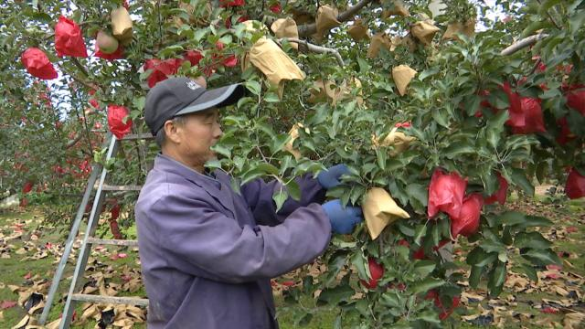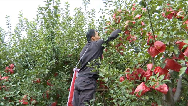 苹果穿上“增收袋”,可减轻病虫害侵袭、降低农药残留,确保果品色泽光亮、绿色环保,有效提高果品品质,能卖出更好的价钱。显头村村民刘永刚家有6亩果园,这几天,他正在果园脱内层袋,看着枝头上个大、饱满、品相好、色泽通透的苹果,刘永刚致富的信心倍增,劲头更足。