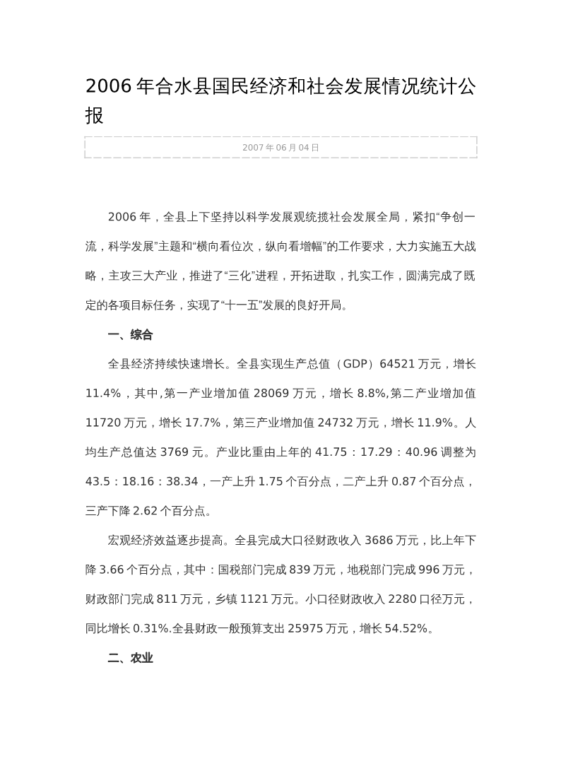 索引号: 3070211020000173000000/2024030500000002 发布机构: 生效日期: 2024-03-05 废止日期: 文 号: 所属主题: 统计数据 2006年合水县国民经济和社会发展情况统计公报 来源: 发布时间:2024-03-05 浏览次数: 次 【字体:小 大】 【打印正文】 分享到: 【字体:小 大】