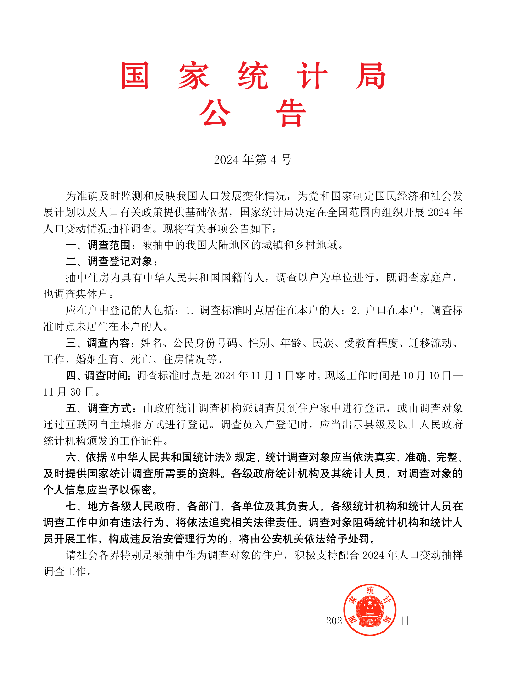 索引号: 3070211020000173000000/2024100800000037 发布机构: 生效日期: 2024-10-08 废止日期: 文 号: 所属主题: 部门文件 国家统计局公告-2024年4号 来源: 发布时间:2024-10-08 浏览次数: 次 【字体:小 大】 【打印正文】 分享到: 【字体:小 大】