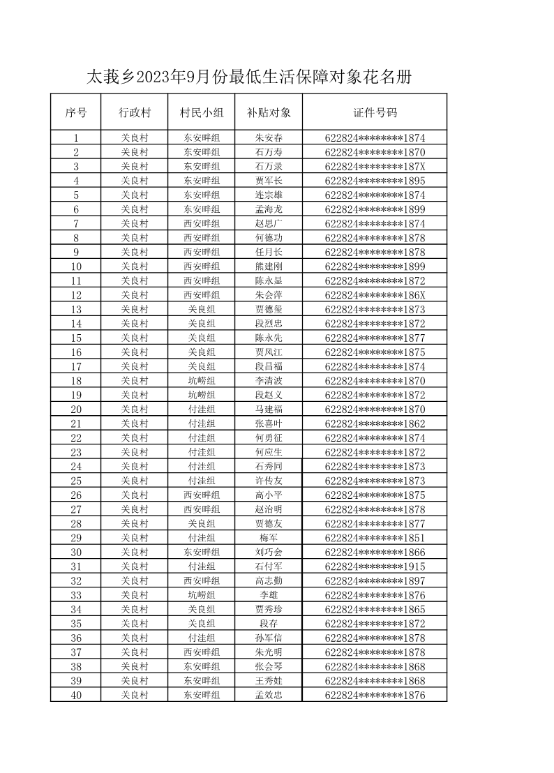 索引号: 3070211020000333000000/2023091200000090 发布机构: 生效日期: 2023-09-12 废止日期: 文 号: 所属主题: 村务公开 太莪乡关良村2023年9月份最低生活保障对象花名册 来源: 发布时间:2023-09-12 浏览次数: 次 【字体:小 大】 【打印正文】 分享到: 【字体:小 大】