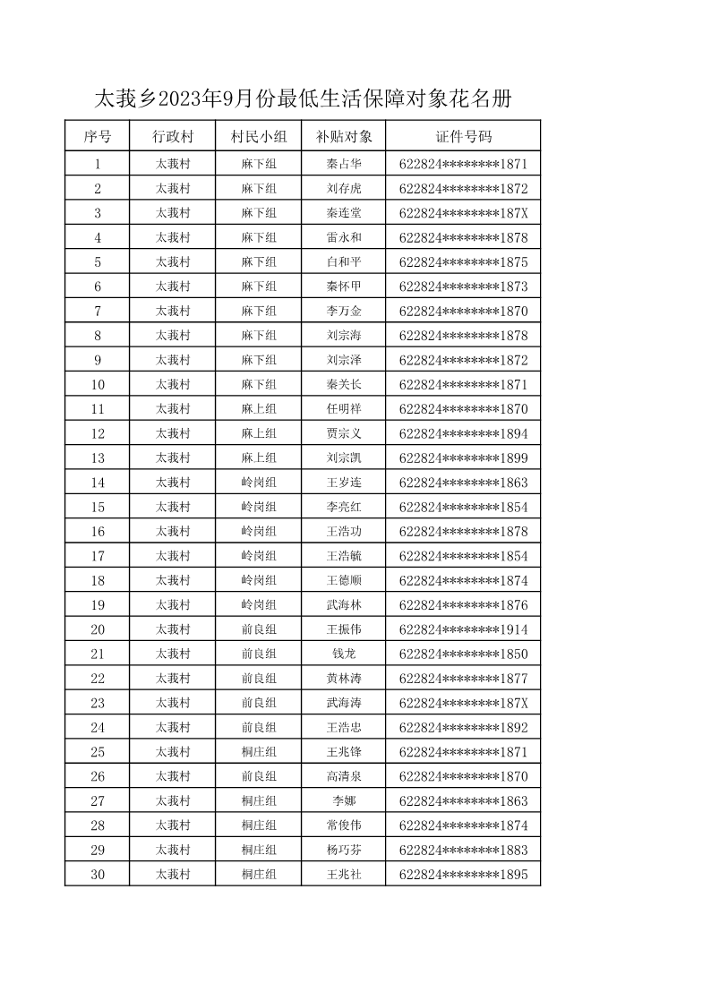 索引号: 3070211020000333000000/2023091200000091 发布机构: 生效日期: 2023-09-12 废止日期: 文 号: 所属主题: 村务公开 太莪乡太莪村2023年9月份最低生活保障对象花名册 来源: 发布时间:2023-09-12 浏览次数: 次 【字体:小 大】 【打印正文】 分享到: 【字体:小 大】