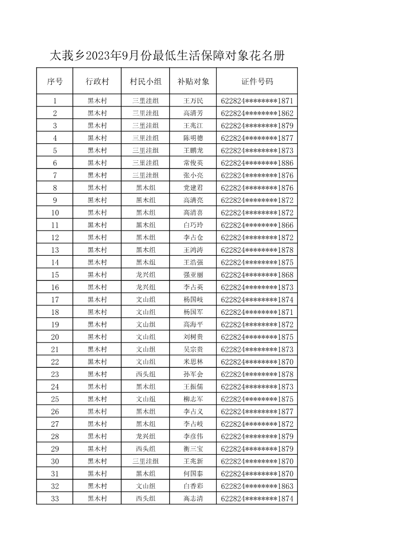 索引号: 3070211020000333000000/2023091200000092 发布机构: 生效日期: 2023-09-12 废止日期: 文 号: 所属主题: 村务公开 太莪乡黑木村2023年9月份最低生活保障对象花名册 来源: 发布时间:2023-09-12 浏览次数: 次 【字体:小 大】 【打印正文】 分享到: 【字体:小 大】