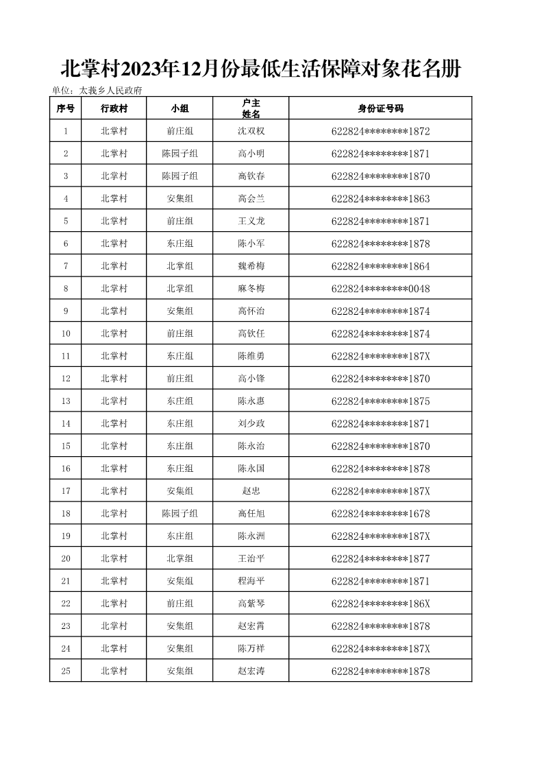 索引号: 3070211020000333000000/2023120500000102 发布机构: 生效日期: 2023-12-05 废止日期: 文 号: 所属主题: 村务公开 北掌村2023年12月份最低生活保障对象花名册 来源: 发布时间:2023-12-05 浏览次数: 次 【字体:小 大】 【打印正文】 分享到: 【字体:小 大】