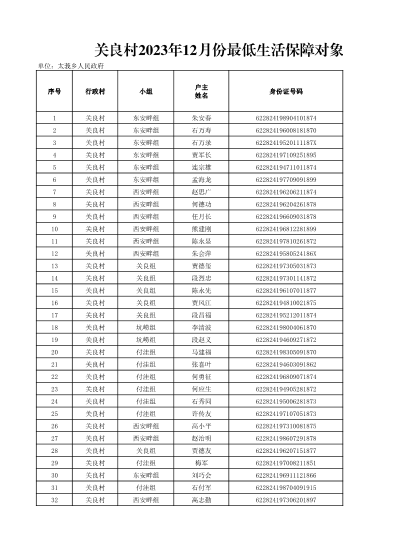 索引号: 3070211020000333000000/2023120500000103 发布机构: 生效日期: 2023-12-05 废止日期: 文 号: 所属主题: 村务公开 关良村2023年12月份最低生活保障对象花名册 来源: 发布时间:2023-12-05 浏览次数: 次 【字体:小 大】 【打印正文】 分享到: 【字体:小 大】