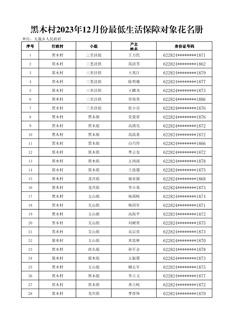 索引号: 3070211020000333000000/2023120500000105 发布机构: 生效日期: 2023-12-05 废止日期: 文 号: 所属主题: 村务公开 黑木村2023年12月份最低生活保障对象花名册 来源: 发布时间:2023-12-05 浏览次数: 次 【字体:小 大】 【打印正文】 分享到: 【字体:小 大】
