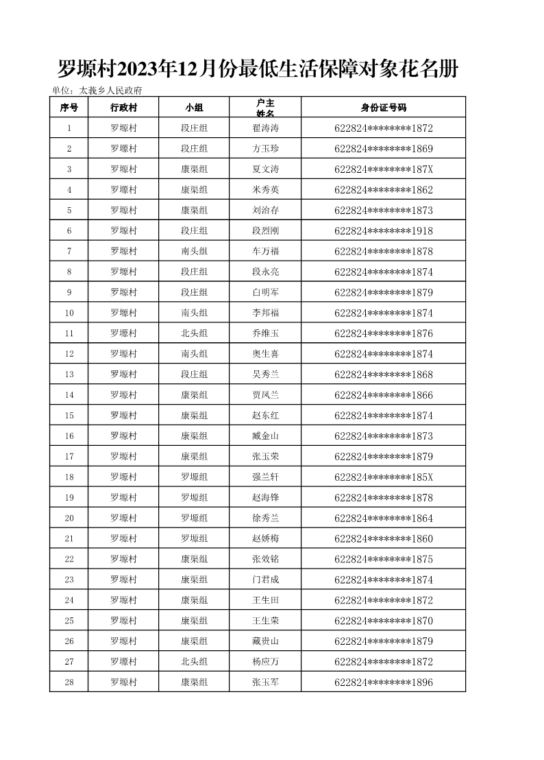 索引号: 3070211020000333000000/2023120500000106 发布机构: 生效日期: 2023-12-05 废止日期: 文 号: 所属主题: 村务公开 罗塬村2023年12月份最低生活保障对象花名册 来源: 发布时间:2023-12-05 浏览次数: 次 【字体:小 大】 【打印正文】 分享到: 【字体:小 大】