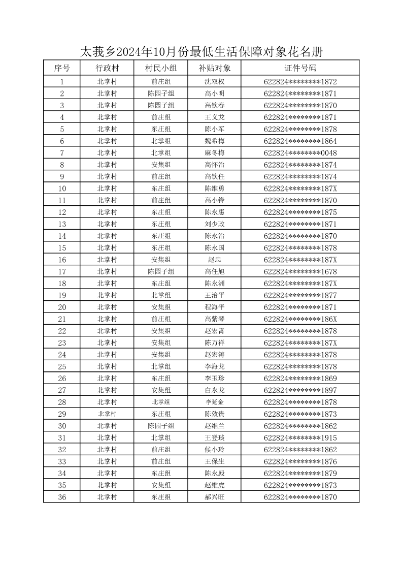 索引号: 3070211020000333000000/2024102400000068 发布机构: 生效日期: 2024-10-24 废止日期: 文 号: 所属主题: 村务公开 太莪乡北掌村2024年10月份最低生活保障对象花名册 来源: 发布时间:2024-10-24 浏览次数: 次 【字体:小 大】 【打印正文】 分享到: 【字体:小 大】