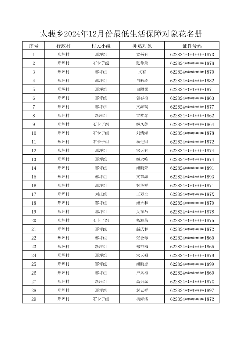 索引号: 3070211020000333000000/2024120200000092 发布机构: 生效日期: 2024-12-02 废止日期: 文 号: 所属主题: 村务公开 太莪乡邢坪村2024年12月份最低生活保障对象花名册 来源: 发布时间:2024-12-02 浏览次数: 次 【字体:小 大】 【打印正文】 分享到: 【字体:小 大】