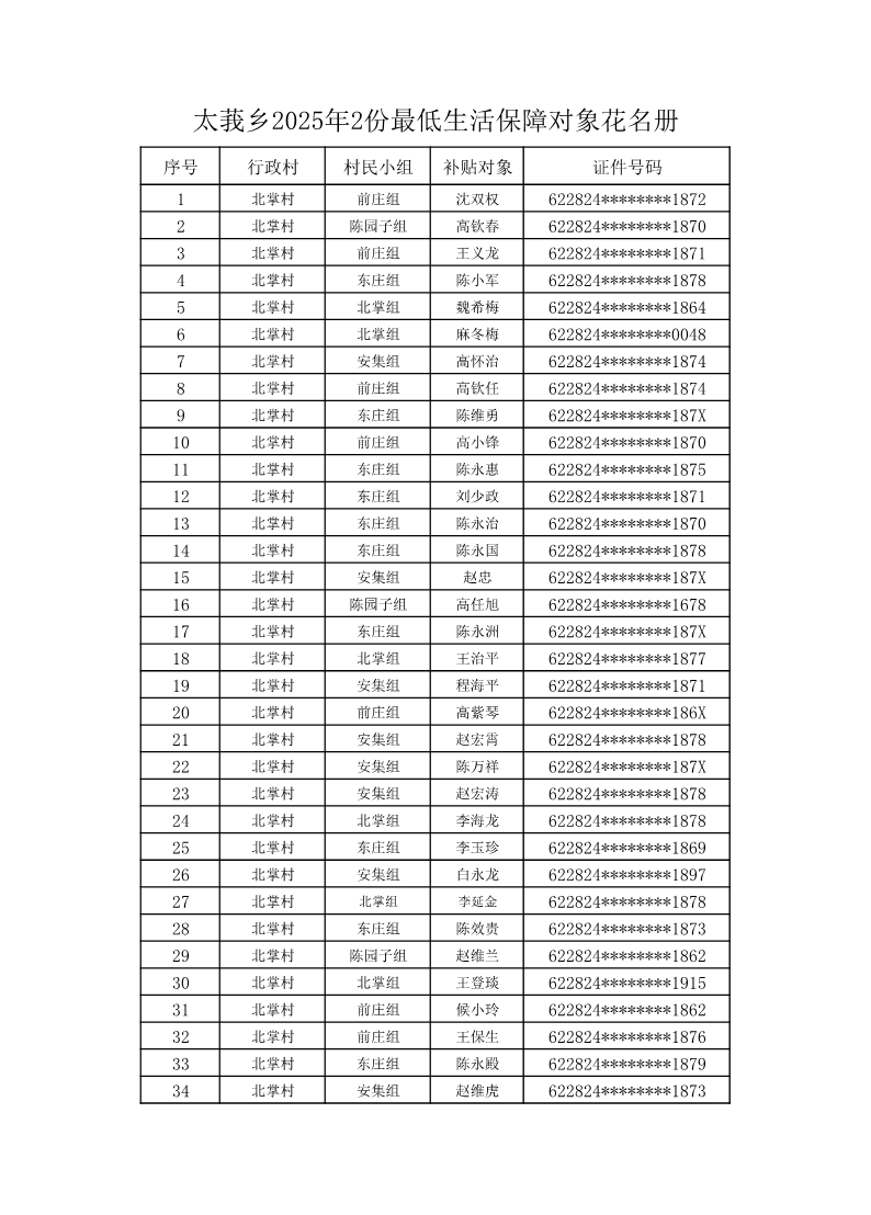 索引号: 3070211020000333000000/2025022100000009 发布机构: 生效日期: 2025-02-21 废止日期: 文 号: 所属主题: 村务公开 太莪乡北掌村2025年2月份最低生活保障对象花名册 来源: 发布时间:2025-02-21 浏览次数: 次 【字体:小 大】 【打印正文】 分享到: 【字体:小 大】