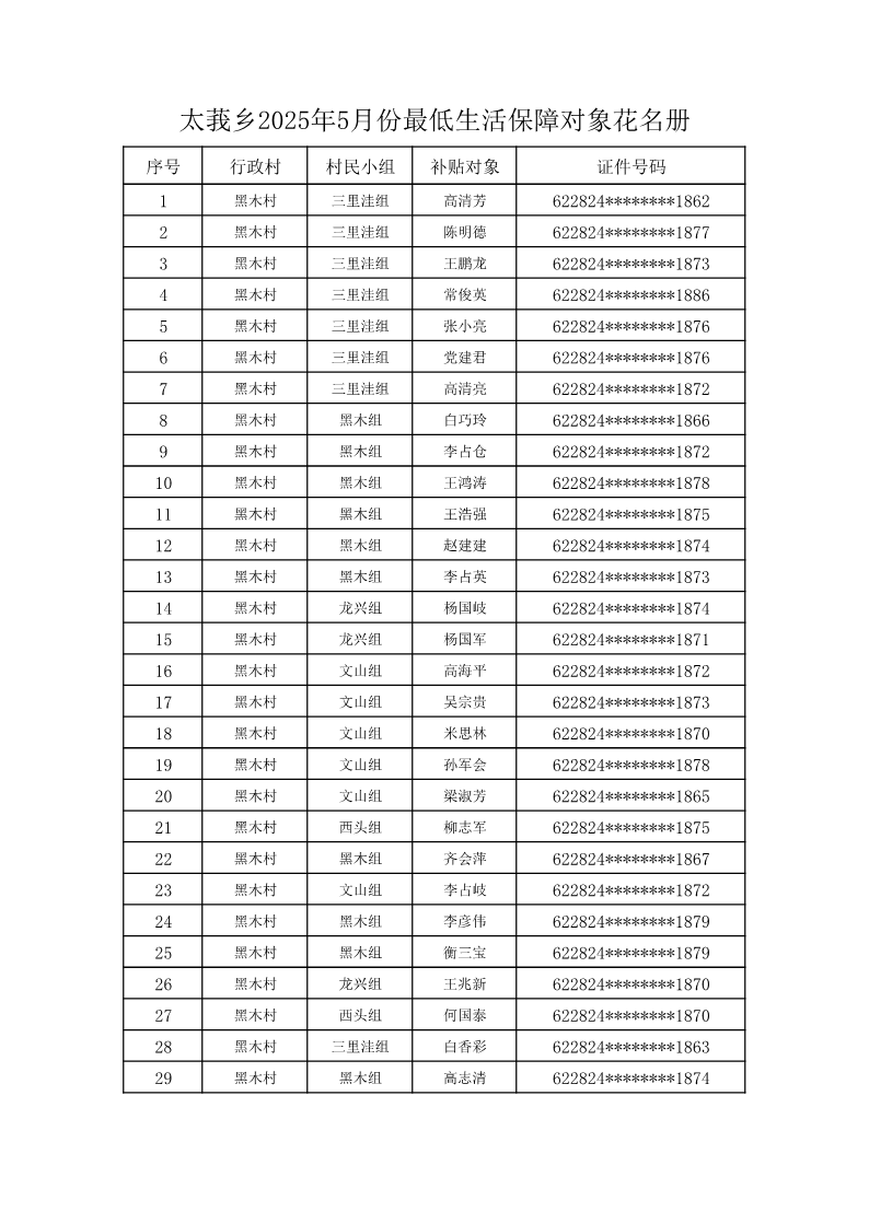 索引号: 3070211020000333000000/2025041400000039 发布机构: 生效日期: 2025-04-14 废止日期: 文 号: 所属主题: 村务公开 太莪乡黑木村2025年5月份最低生活保障对象花名册 来源: 发布时间:2025-04-14 浏览次数: 次 【字体:小 大】 【打印正文】 分享到: 【字体:小 大】