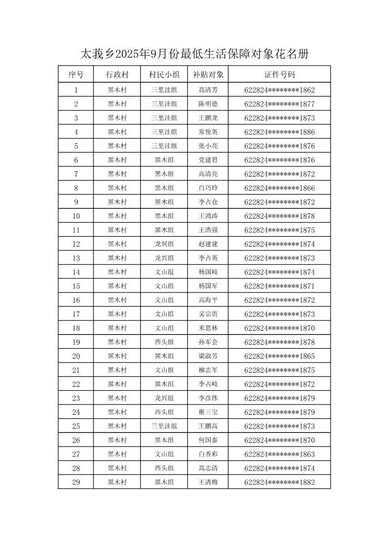索引号: 3070211020000333000000/2025102100000076 发布机构: 生效日期: 2025-09-23 废止日期: 文 号: 所属主题: 村务公开 太莪乡黑木村2025年9月份最低生活保障对象花名册 来源: 发布时间:2025-09-23 浏览次数: 次 【字体:小 大】 【打印正文】 分享到: 【字体:小 大】