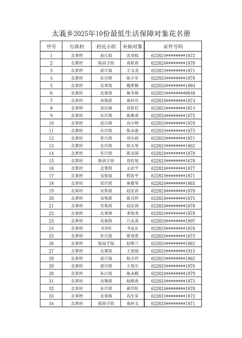 索引号: 3070211020000333000000/2025102100000079 发布机构: 生效日期: 2025-10-21 废止日期: 文 号: 所属主题: 村务公开 太莪乡北掌村2025年10月份最低生活保障对象花名册 来源: 发布时间:2025-10-21 浏览次数: 次 【字体:小 大】 【打印正文】 分享到: 【字体:小 大】