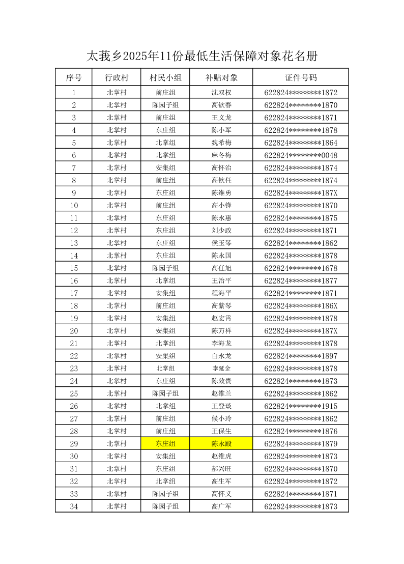 索引号: 3070211020000333000000/2025110700000086 发布机构: 生效日期: 2025-11-07 废止日期: 文 号: 所属主题: 村务公开 太莪乡北掌村2025年11月份最低生活保障对象花名册 来源: 发布时间:2025-11-07 浏览次数: 次 【字体:小 大】 【打印正文】 分享到: 【字体:小 大】