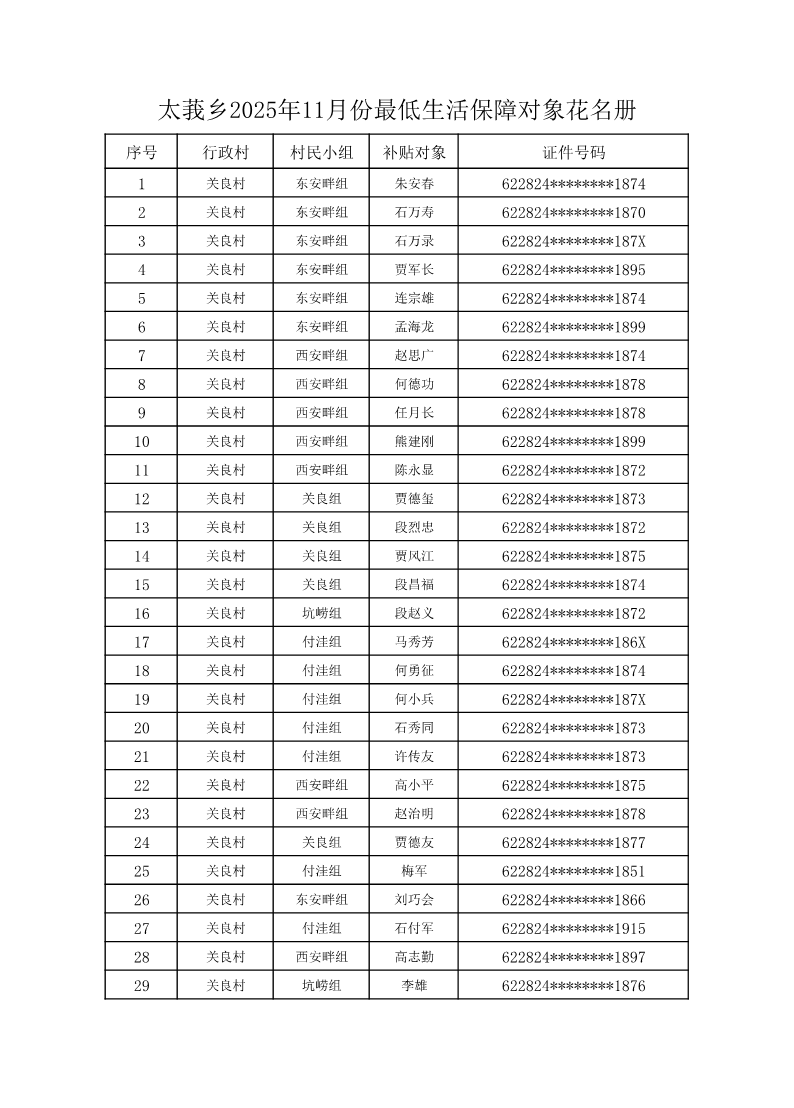索引号: 3070211020000333000000/2025110700000087 发布机构: 生效日期: 2025-11-07 废止日期: 文 号: 所属主题: 村务公开 太莪乡关良村2025年11月份最低生活保障对象花名册 来源: 发布时间:2025-11-07 浏览次数: 次 【字体:小 大】 【打印正文】 分享到: 【字体:小 大】
