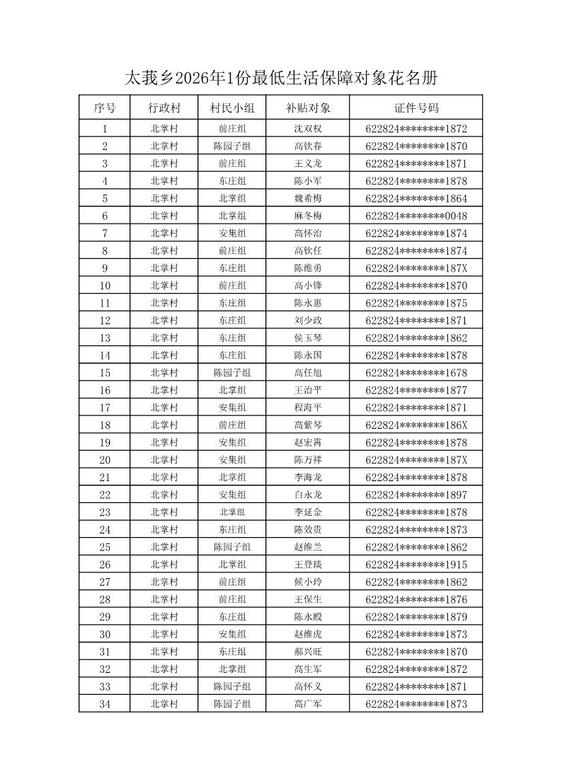 索引号: 3070211020000333000000/2026012000000001 发布机构: 生效日期: 2026-01-20 废止日期: 文 号: 所属主题: 村务公开 太莪乡北掌村2026年1月份最低生活保障对象花名册 来源: 发布时间:2026-01-20 浏览次数: 次 【字体:小 大】 【打印正文】 分享到: 【字体:小 大】
