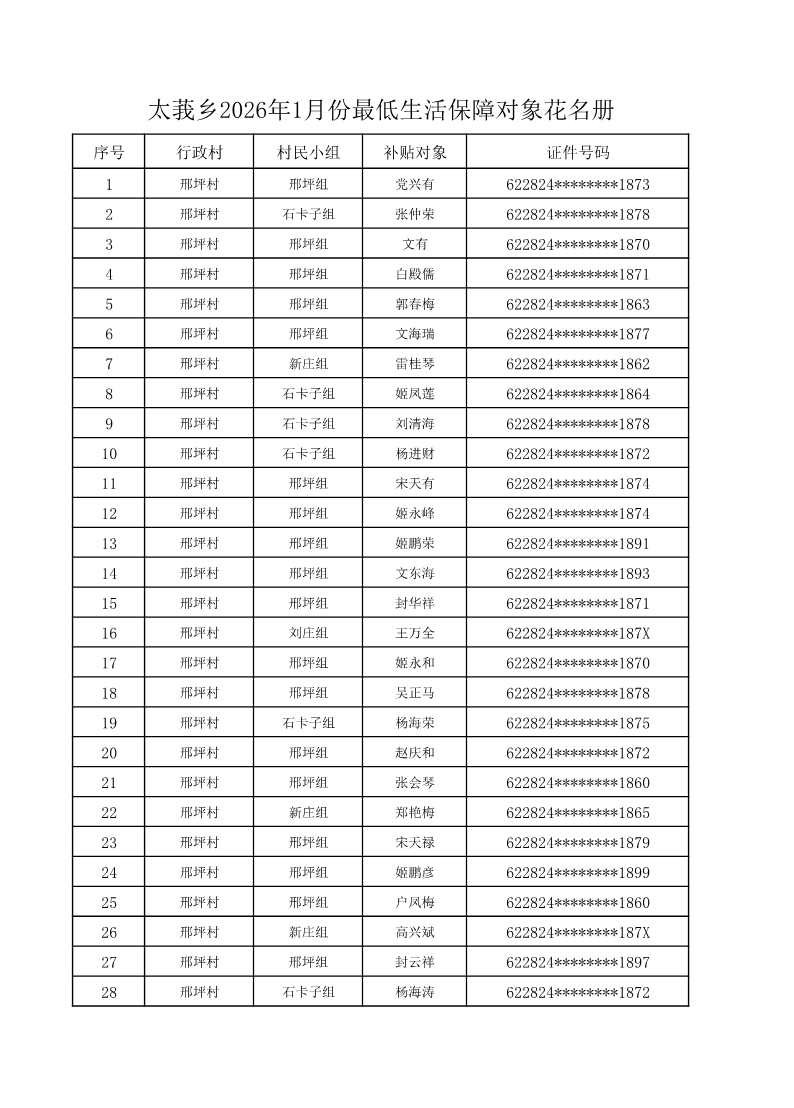 索引号: 3070211020000333000000/2026012000000006 发布机构: 生效日期: 2026-01-20 废止日期: 文 号: 所属主题: 村务公开 太莪乡邢坪村2026年1月份最低生活保障对象花名册 来源: 发布时间:2026-01-20 浏览次数: 次 【字体:小 大】 【打印正文】 分享到: 【字体:小 大】