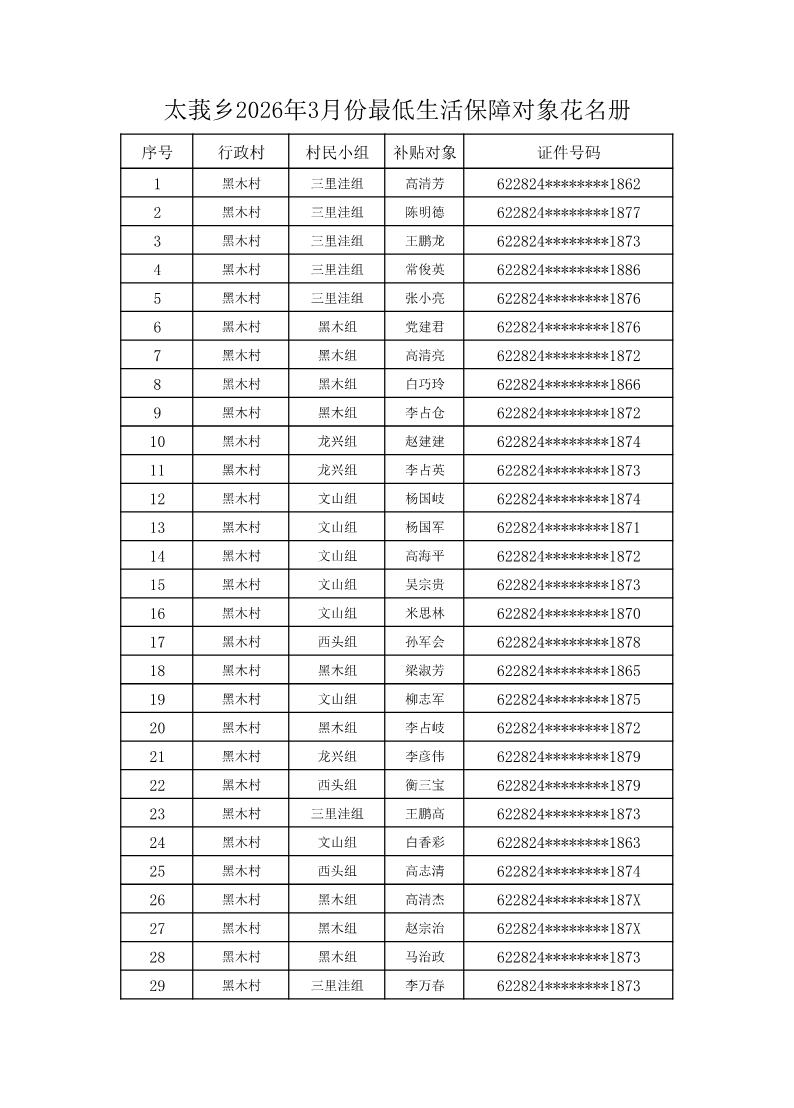 索引号: 3070211020000333000000/2026031600000017 发布机构: 生效日期: 2026-03-16 废止日期: 文 号: 所属主题: 村务公开 太莪乡黑木村2026年3月份最低生活保障对象花名册 来源: 发布时间:2026-03-16 浏览次数: 次 【字体:小 大】 【打印正文】 分享到: 【字体:小 大】