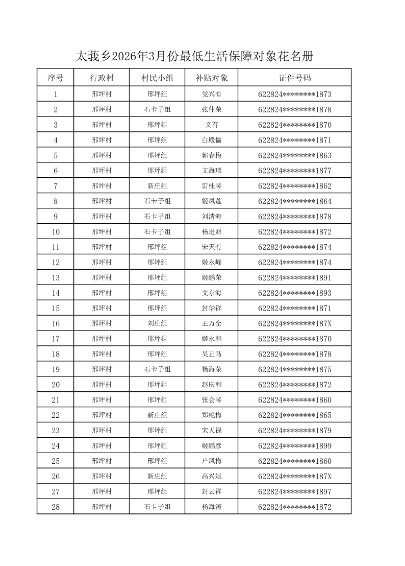 索引号: 3070211020000333000000/2026031600000019 发布机构: 生效日期: 2026-03-16 废止日期: 文 号: 所属主题: 村务公开 太莪乡邢坪村2026年3月份最低生活保障对象花名册 来源: 发布时间:2026-03-16 浏览次数: 次 【字体:小 大】 【打印正文】 分享到: 【字体:小 大】