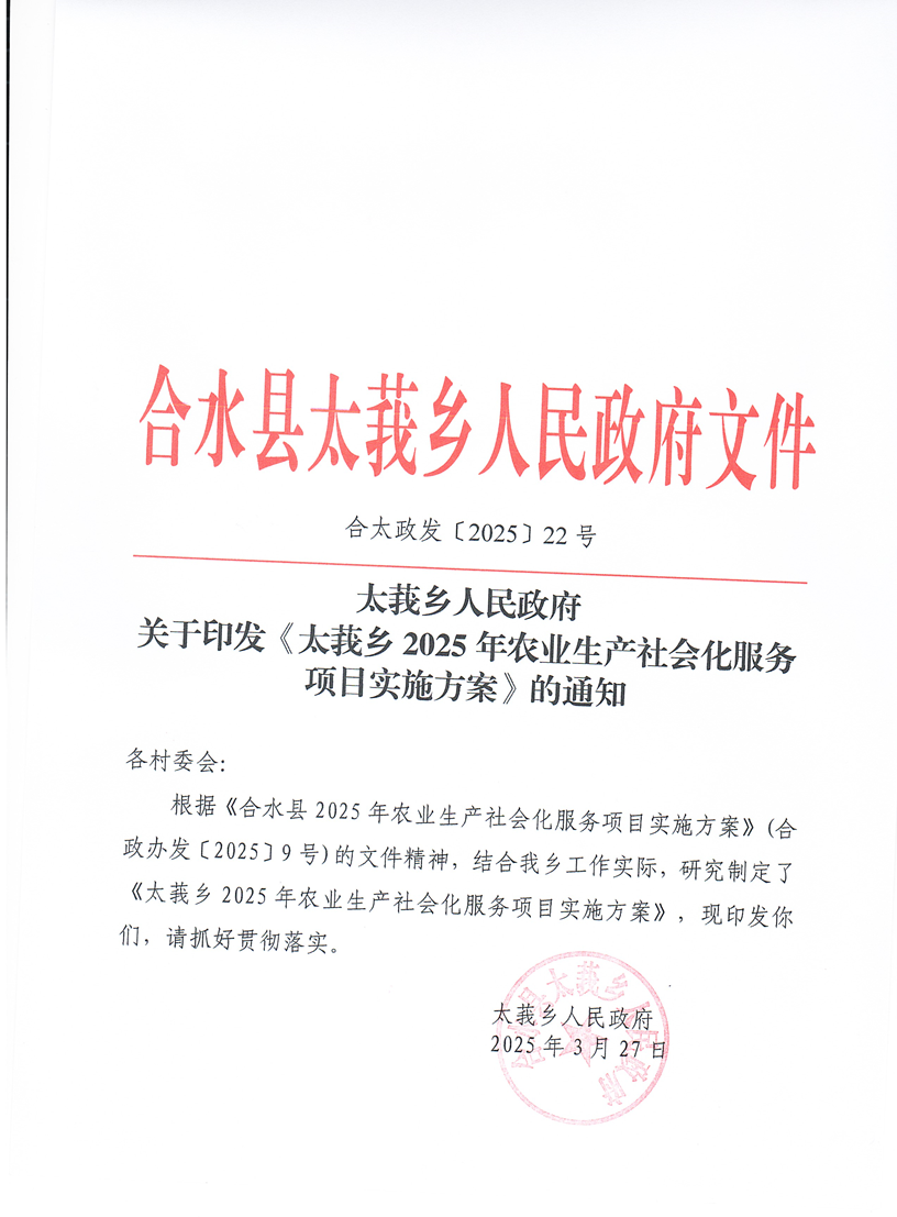 索引号: 3070211020000333000000/2025112600000092 发布机构: 生效日期: 2025-03-28 废止日期: 文 号: 所属主题: 政府文件 关于印发《太莪乡2025年农业生产社会化服务项目实施方案》的通知 来源: 发布时间:2025-03-28 浏览次数: 次 【字体:小 大】 【打印正文】 分享到: 【字体:小 大】
