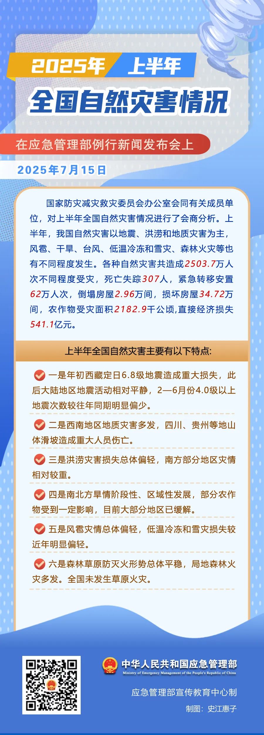 索引号: 3070211020000103000000/2025082000000047 发布机构: 生效日期: 2025-07-17 废止日期: 文 号: 所属主题: 通知公告 【新闻发布】2025年上半年全国自然灾害情况 来源: 发布时间:2025-07-17 浏览次数: 次 【字体:小 大】 【打印正文】 分享到: 【字体:小 大】