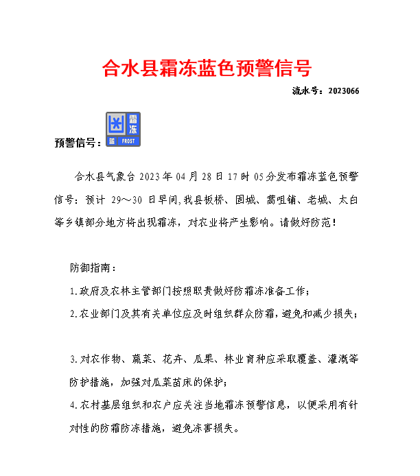 索引号: 3070211020000103000000/2023042800000016 发布机构: 生效日期: 2023-04-28 废止日期: 文 号: 所属主题: 预警信息 合水县蓝色霜冻预警信号 来源: 发布时间:2023-04-28 浏览次数: 次 【字体:小 大】 合水县霜冻蓝色预警.png 【打印正文】 分享到: 【字体:小 大】