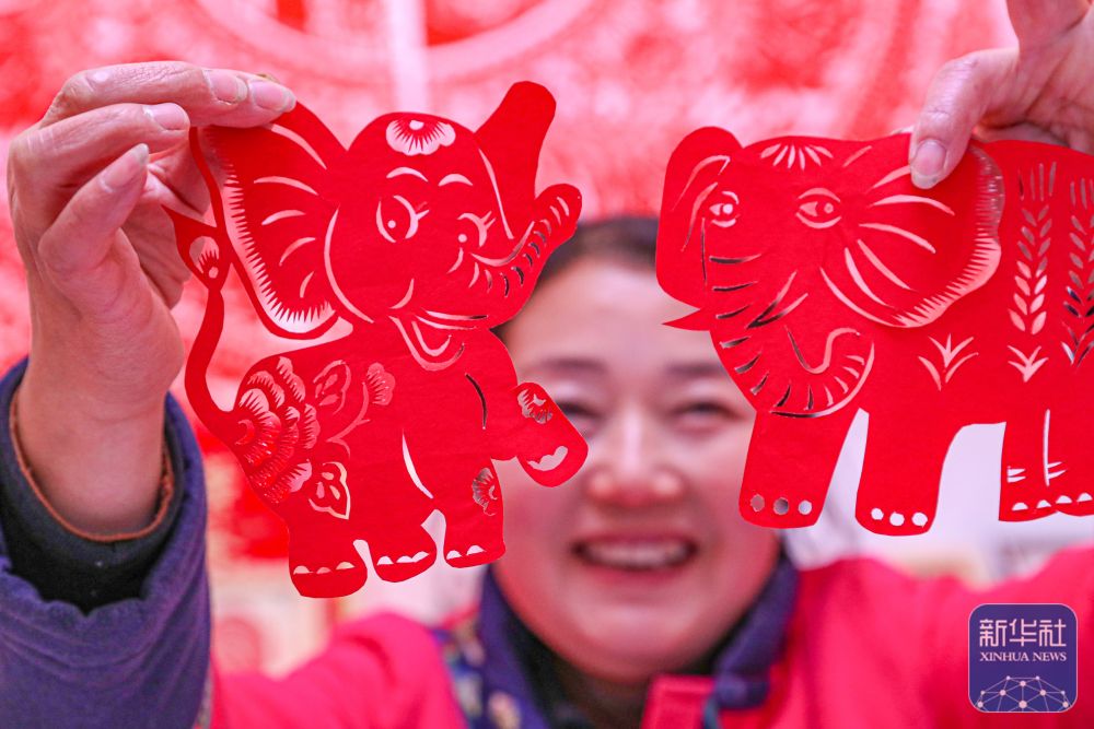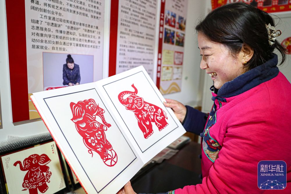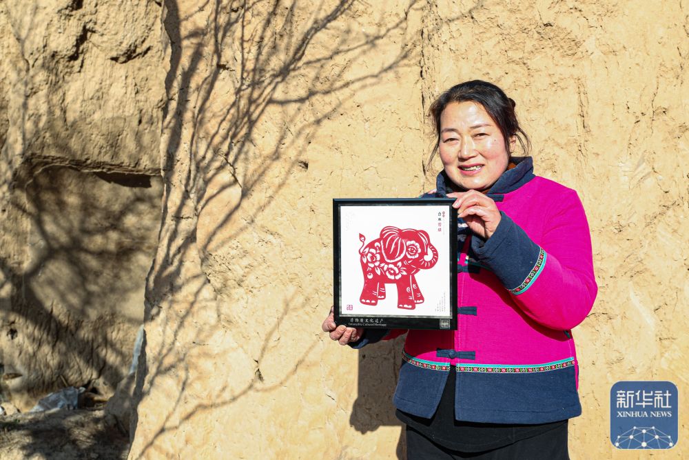 1月4日,在庆阳市合水县西华池镇唐旗村,张雪峰展示黄河古象主题剪纸作品。