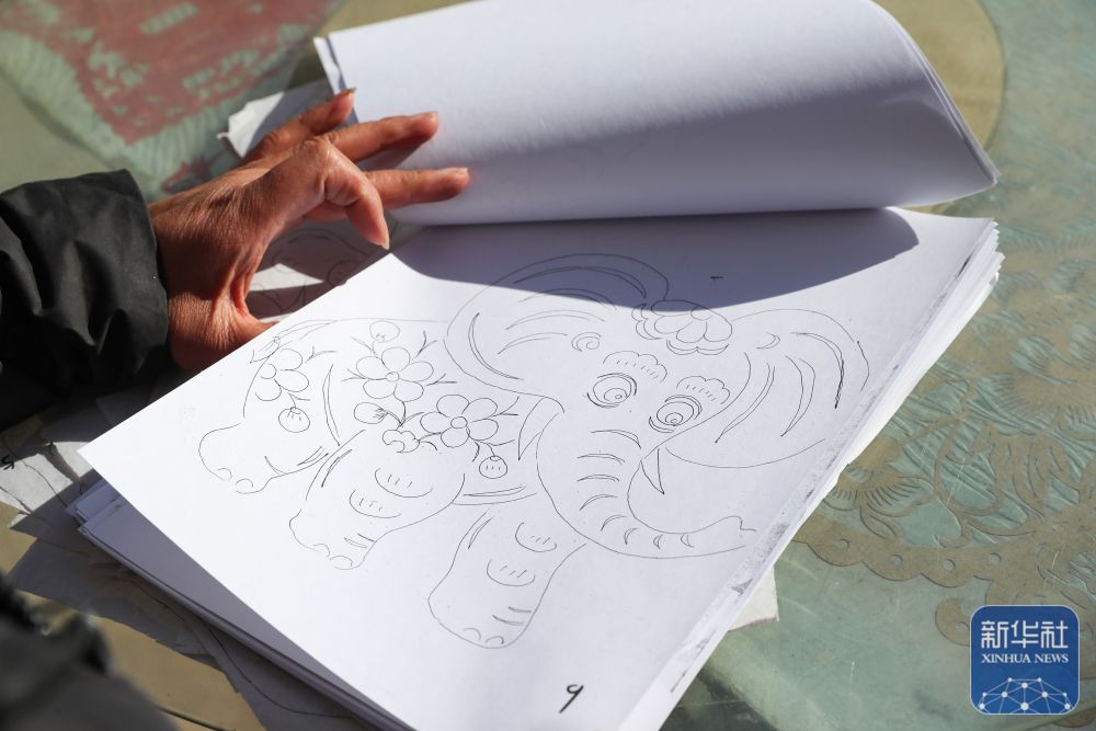1月5日,在庆阳市合水县西华池镇唐旗村,张雪峰展示创作黄河古象主题剪纸时的草稿。