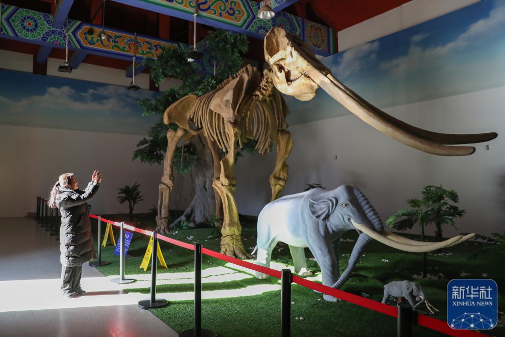 1月5日,在庆阳市合水县陇东石刻艺术博物馆黄河古象展厅,张雪峰拍摄黄河象化石(复制品)。