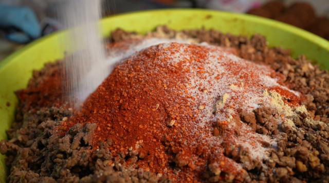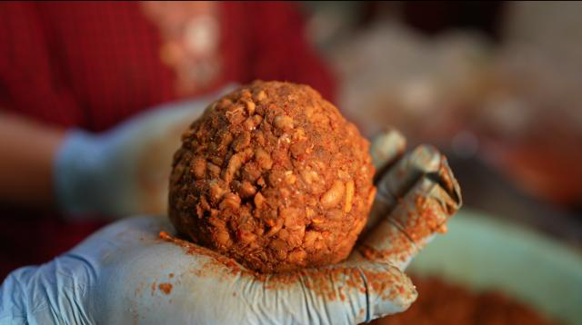 首先是要精选好上等的黄豆,放到石磨上拉成均匀的豆瓣,用簸箕簸掉豆皮。接着,在大锅内煮熟(最好是用煮过面的面汤)。然后用袋子装起来,扎住口袋,放在土炕上捂,要保持均匀的土炕温度让豆瓣进行充分的发酵。这样经过5至7天,等到豆瓣充分发酵后,便停止加热。等到豆瓣冷却后,倒入空盆,拌上准备好的辣椒面、食盐、花椒面等调料,最后用手捏成小团。每次吃之前用温水泡开,将其捏碎,锅中倒油,加入事先准备好的葱花、蒜末、肉末等调味,炒出香味即可食用