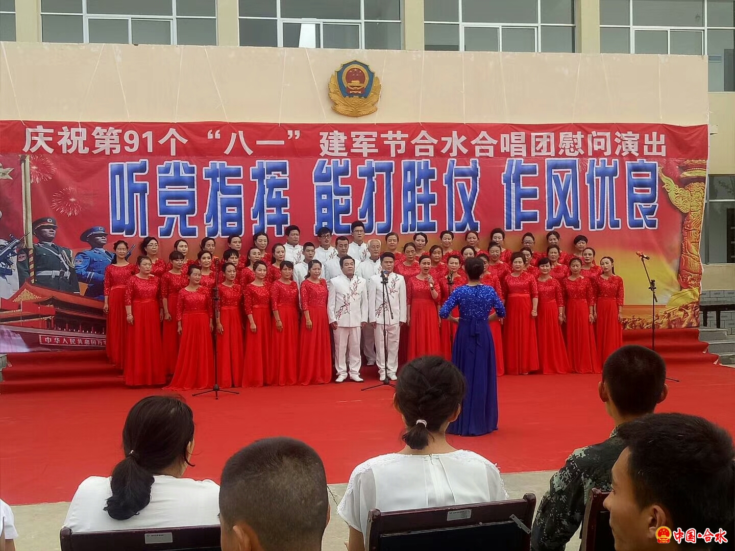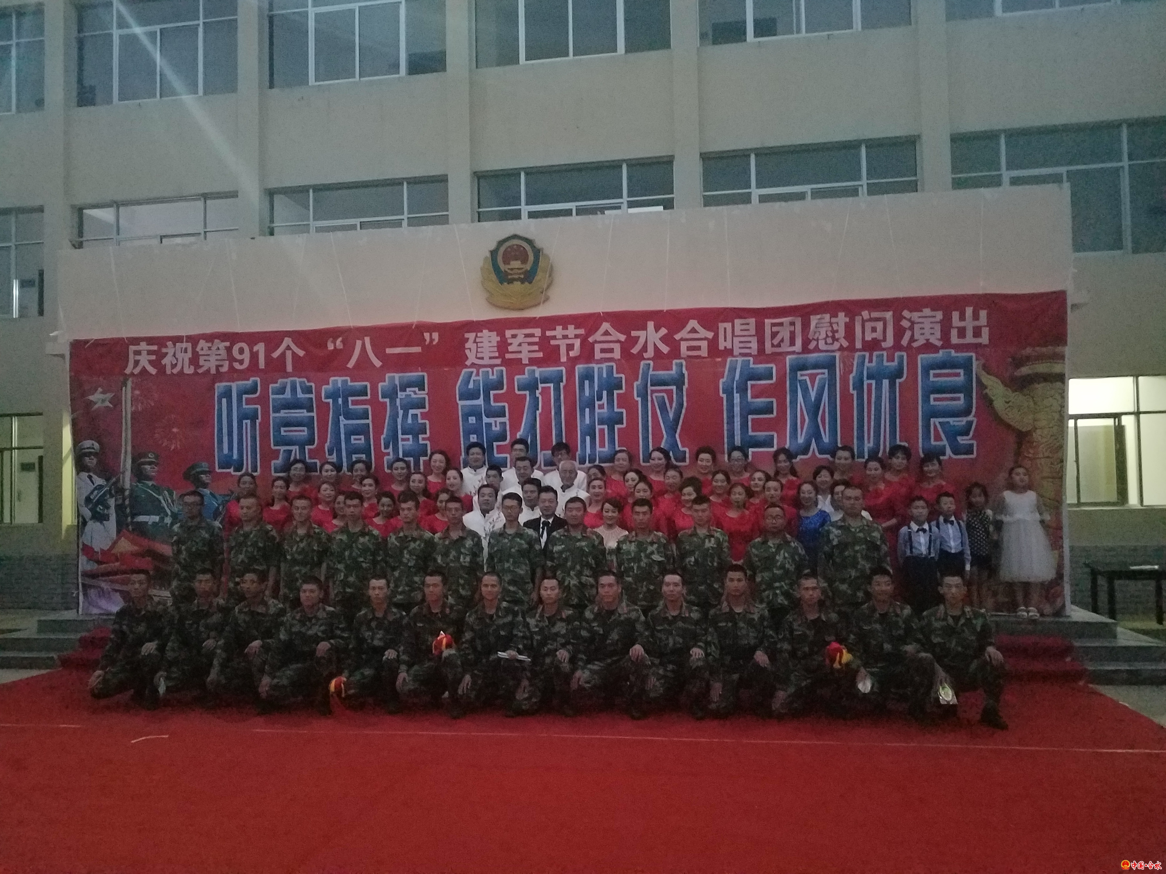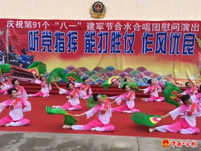 为庆祝中国人民解放军建军91周年,扎实做好军(警)民双拥共建工作,7月31日, 合水县粮食稽查大队协同合水合唱团走进武警合水中队,为官兵们送去一台极具时代内涵的庆“八一”歌舞晚会,受到广大官兵们的热烈欢迎。