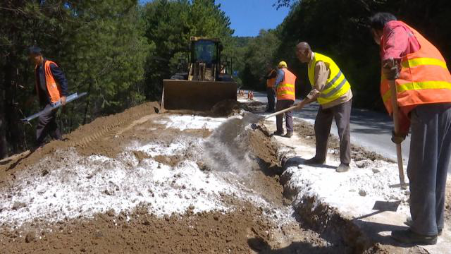 (309国道蒿咀铺乡子午林隧道西坡施工现场,工人正在进行路基滑塌填筑)