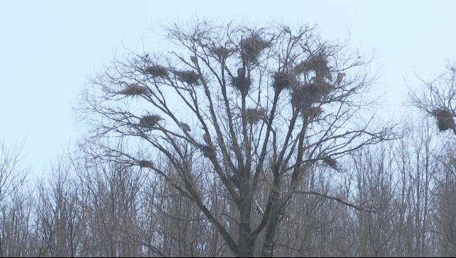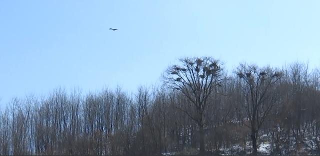 3月2日,记者在太白镇安子坪村看到,苍鹭们或在巢穴里歇息,或在树林上空盘旋。据记者观察,目前已有30多个巢穴,大约有50多只苍鹭在这里栖息。