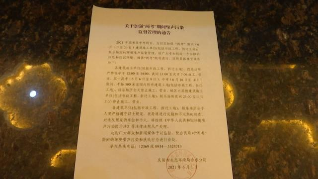 庆阳市生态环境局合水分局副局长朱天龙说:“在两考期间,如有发现夜间施工、噪音扰民的违法行为,可拨打24小时环保投诉热线12369进行举报,我们将第一时间处理,争取为高考提供一个良好的考试环境。”