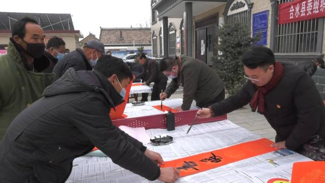 党员带头做表率,墨宝飘香送祝福。新春来临之际,合水县委组织部、县文联先后深入肖咀镇肖咀村、段家集乡王庄村、店子乡吕家岘子村和板桥镇瑶子头村,开展 “学全会、迎新春、送祝福”活动,现场为群众书写春联,宣讲党的十九届六中全会精神。