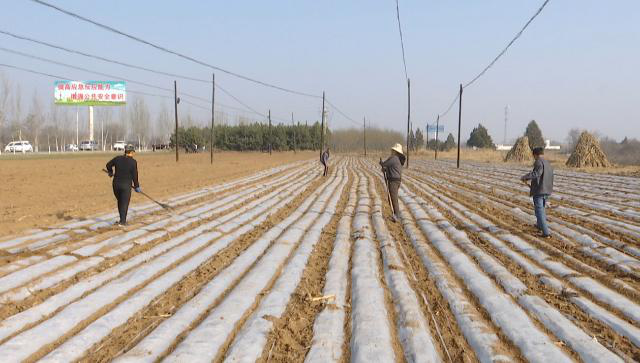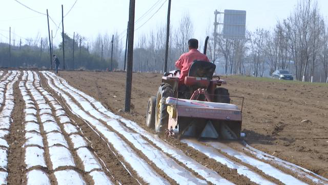 近日,记者在吉岘镇黄寨子村的农田里看到,覆膜机来回穿梭在刚刚旋耕过的松软的土地上,进行覆膜作业,村民们正忙着覆土、压土腰带。