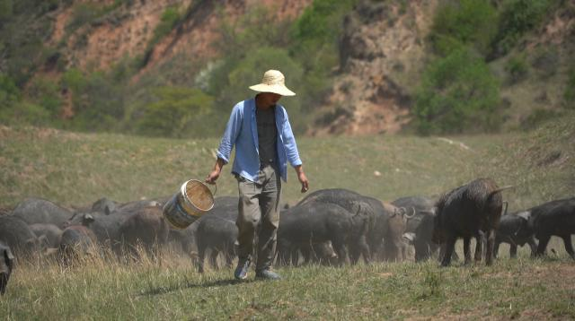 在村民吕元泰的林下养殖基地,随着一声响亮的呼喊声,林下散养的猪群都向吕元泰跑了过来。这是吕元泰每天必须要完成的固定工作。每天中午,他都会给所饲养的猪投喂玉米等粮食饲料。