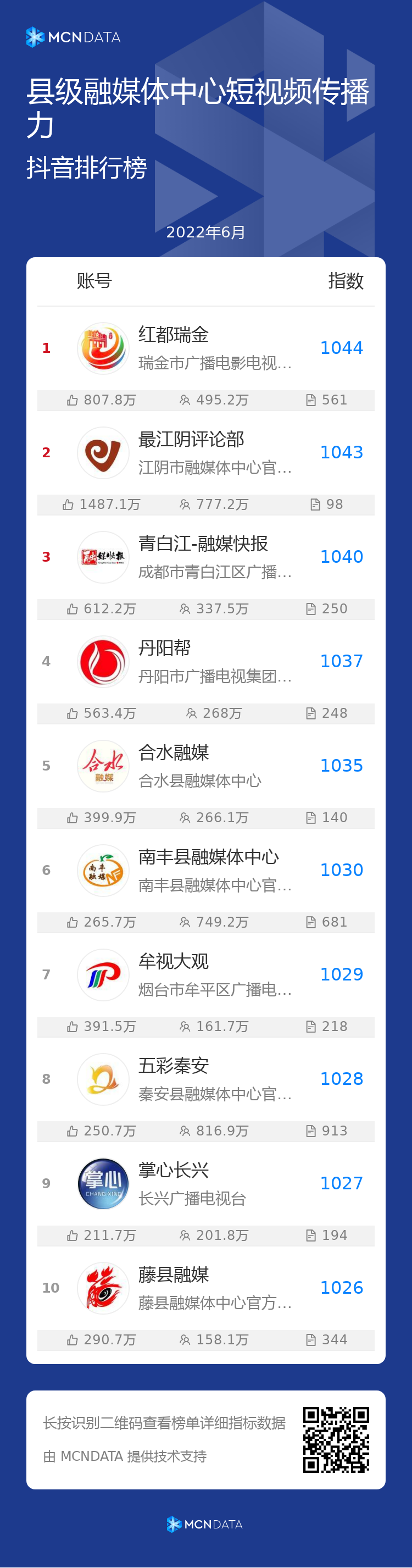 全国县级融媒体中心短视频传播力榜单是由新华智云依据县融账号的点赞数、发布数、总粉丝数等数据,以点赞量、播放量为主,结合单均点赞/播放、爆款占比、发文活跃等指标,综合计算得出。媒体大脑每月发布该榜单。
