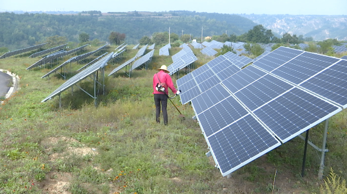近日,记者在吕家岘子扶贫电站看到,一排排蓝色光伏板整齐排列,在阳光照耀下熠熠生辉,工作人员正在场内进行日常的巡查、维护、锄草。昔日产业结构单一的黄土地乘着光伏产业发展的春风,也真正从青山变成了“金山”。