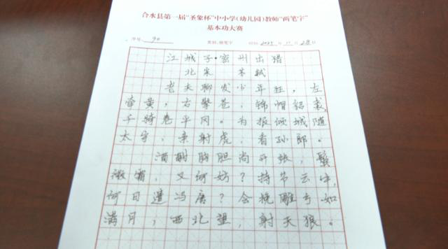 11月28日,合水县第一届“圣象杯”中小学(幼儿园)教师“钢笔字、粉笔字”基本功展示活动在乐蟠小学举行。