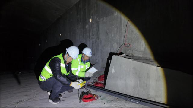 质量核验检测现场,专业技术团队提前对桥梁建立试验模型,制定了科学的试验检测方案,并在桥体关键点位及桥梁内部结构精准安装各类专业测试仪器,为数据监测做好充分准备。随后,11辆31吨/车的荷载车辆严格按照检测方案规划的路线,有序驶入指定区域完成施载。30余名工作人员与专业技术人员分工明确、协同配合,依托高精度传感器、动态监测仪等高科技设备,对桥梁结构的应变、位移、挠度等关键指标进行实时采集与全方位监测,确保试验数据精准有效。