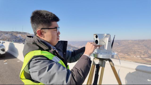 G309线西合公路项目瓦岗川特大桥进行交工质量核验检测的工作人员安装检测设备。