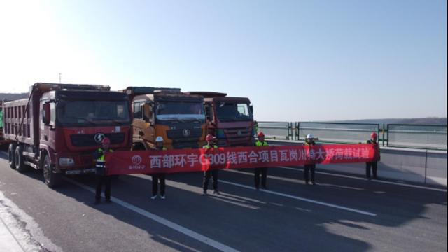 G309线西合公路项目瓦岗川特大桥进行交工质量核验检测的工作人员指挥荷载车辆。