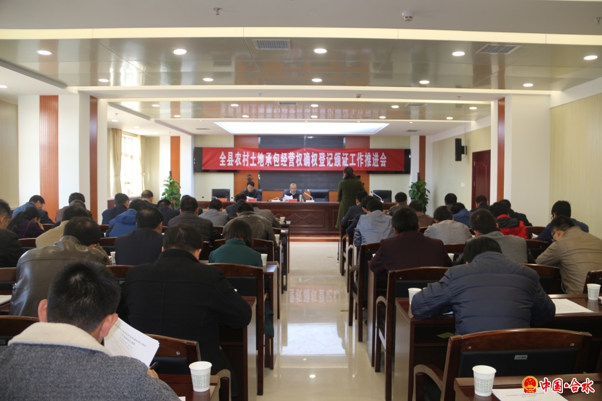 10月31日,合水县再次召开了全县农村土地承包经营权确权登记颁证工作推进会。参加会议的有县农地确权领导小组副组长县政府党委成员刘小宁、各成员单位负责人、县农地确权办主任、副主任、12乡镇乡镇长、分管领导、业务主办、各技术公司项目负责人、县农地确权办全体工作人员,共计62人参加了会议。此次会议的主要目的是传达市政府督查组工作督查反馈意见,通报全县工作进展,深刻剖析存在问题,紧扣时间节点,倒排工期,加压使劲,确保11月底完成土地承包合同签订的工作任务。