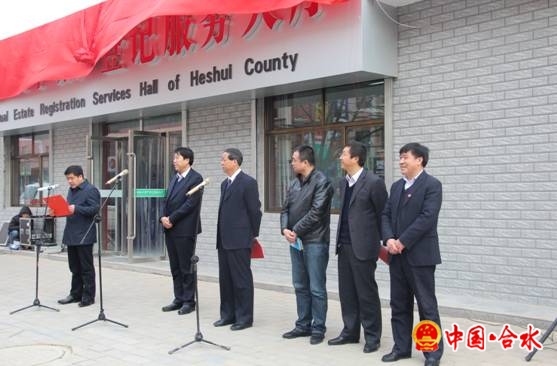仪式由曹育铮主持,县政府办主任和鹏华宣读了《合水县人民政府关于实施不动产统一登记的通告》,沈文祥、周宏杰发表了重要讲话,并共同为合水县不动产登记服务大厅揭牌。出席活动的市、县领导现场为3户企业颁发了大厅落成后首批不动产产权证书,为1户企业颁发了不动产证明。