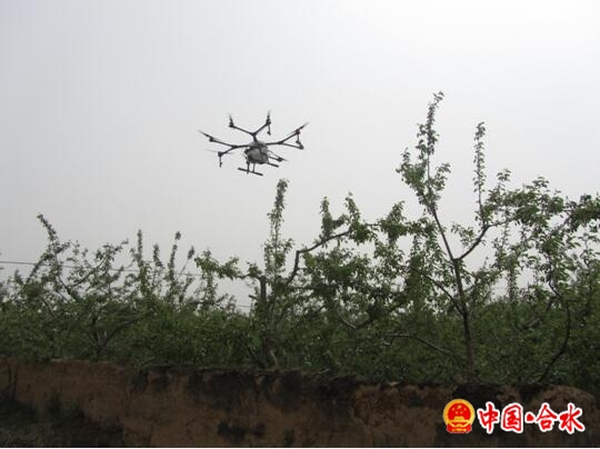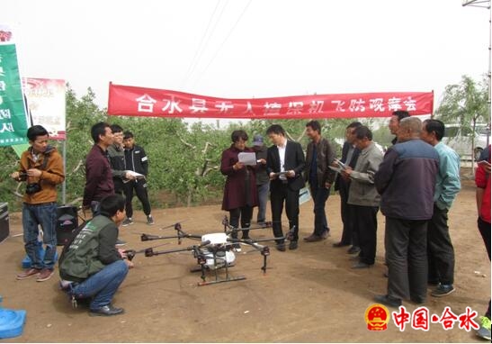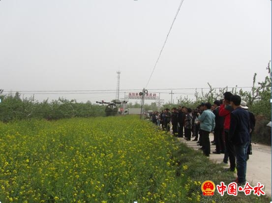 5月5日,合水县农广校会同合水县新兴有机农产品农民专业合作社组织2016年新型职业农民苹果生产专业学员在西华池镇杨沟崂行政村谭岭子有机苹果示范基地“苹果岛”观看了甘肃御果侠农业科技服务公司在苹果树、冬油菜、冬小麦等作物上使用无人机喷洒农药、叶面肥现场示范作业。