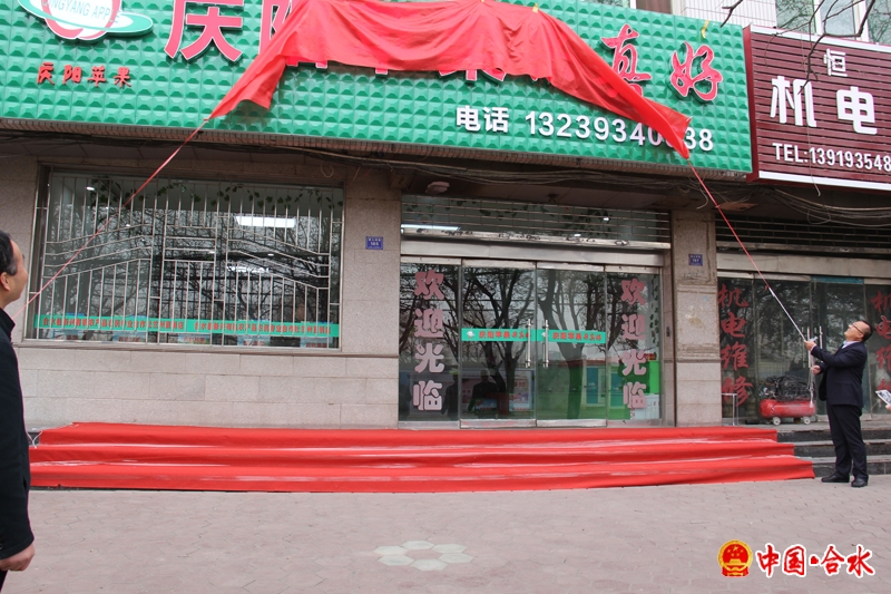 副县长刘小宁、合水县新兴有机农产品农民专业合作社董事长何会宁为“庆阳·合水苹果兰州直销店”揭牌。