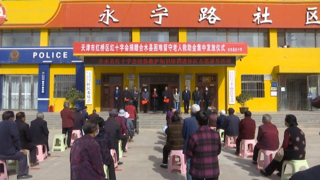4月21日,天津市红桥区红十字会捐赠合水县困难留守老人救助金集中发放仪式在永宁路社区举行,天津市红桥区红十字会委托庆阳市红十字会为合水县60名困难留守老人每人发放了1000元救助金。