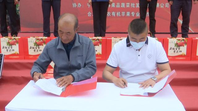 推介会上,合水县利农有机苹果专业合作社与宁夏四季鲜果品蔬菜批发市场好多果(宁夏)农副产品销售有限公司订了供销协议。
